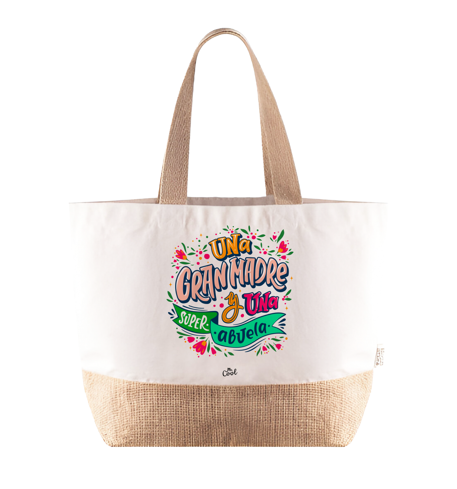 Bolsa de asa larga con frases originales marca Mr. Cool, fabricada en algodón de reciclado de 320 gr/m² y base de yute.