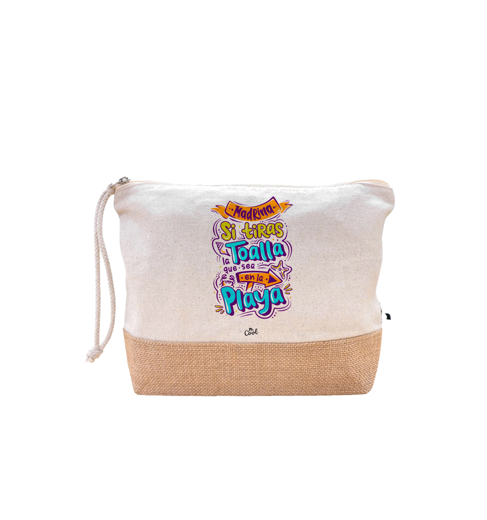 Neceser con frases originales marca Mr. Cool, fabricado en algodón de 220g/m² con base de yute y asa larga
