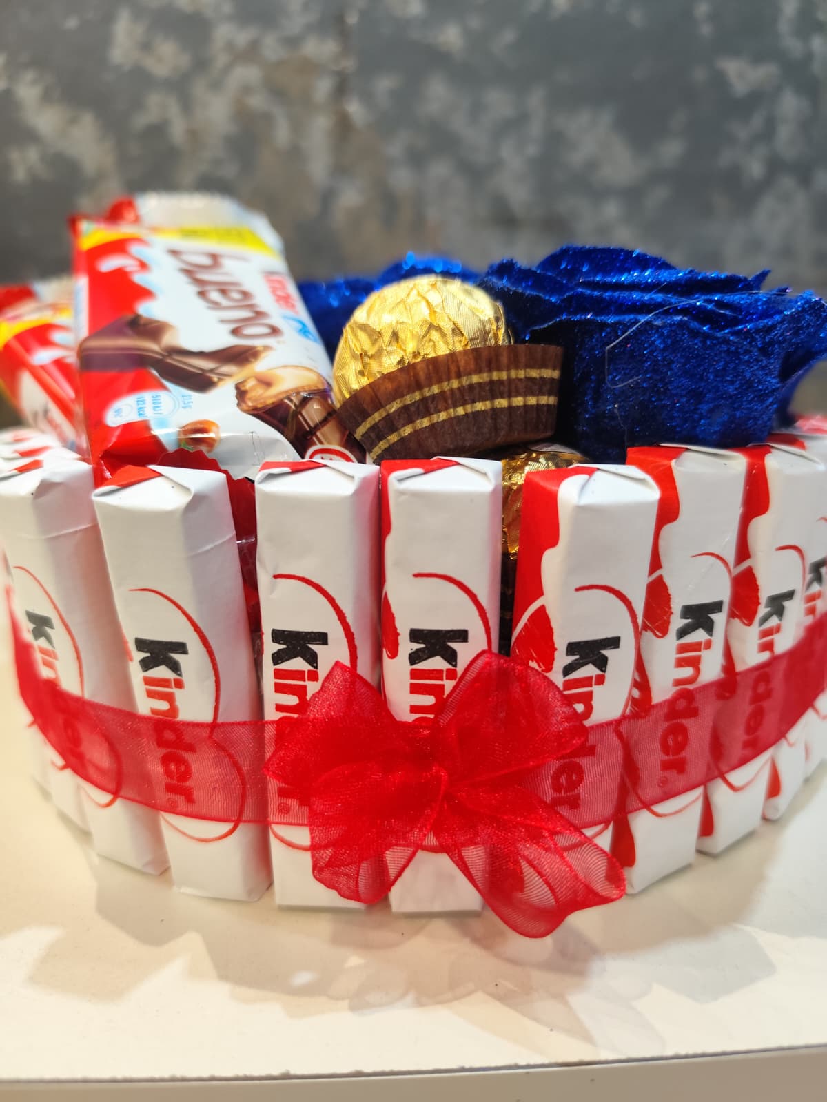 Tarta de Kinder y Ferrero Rocher con Kinder Bueno. Incluye 5 rosas artificiales de purpurina.